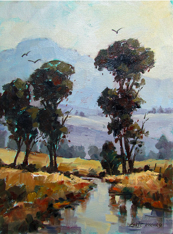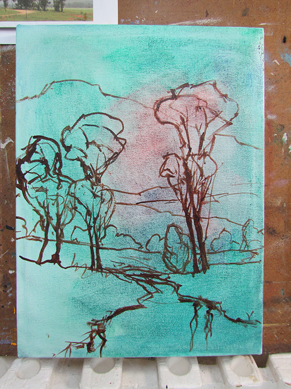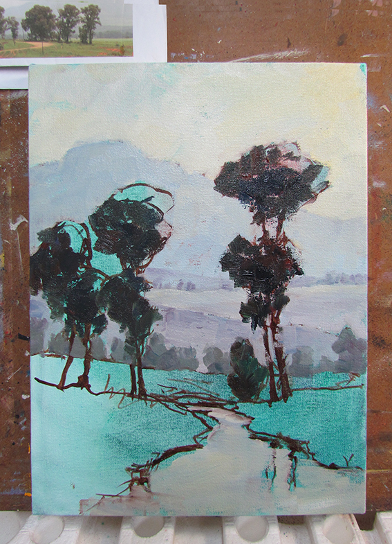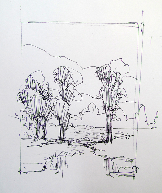 Blocking in the distant landscape and the dark middleground values in the trees.